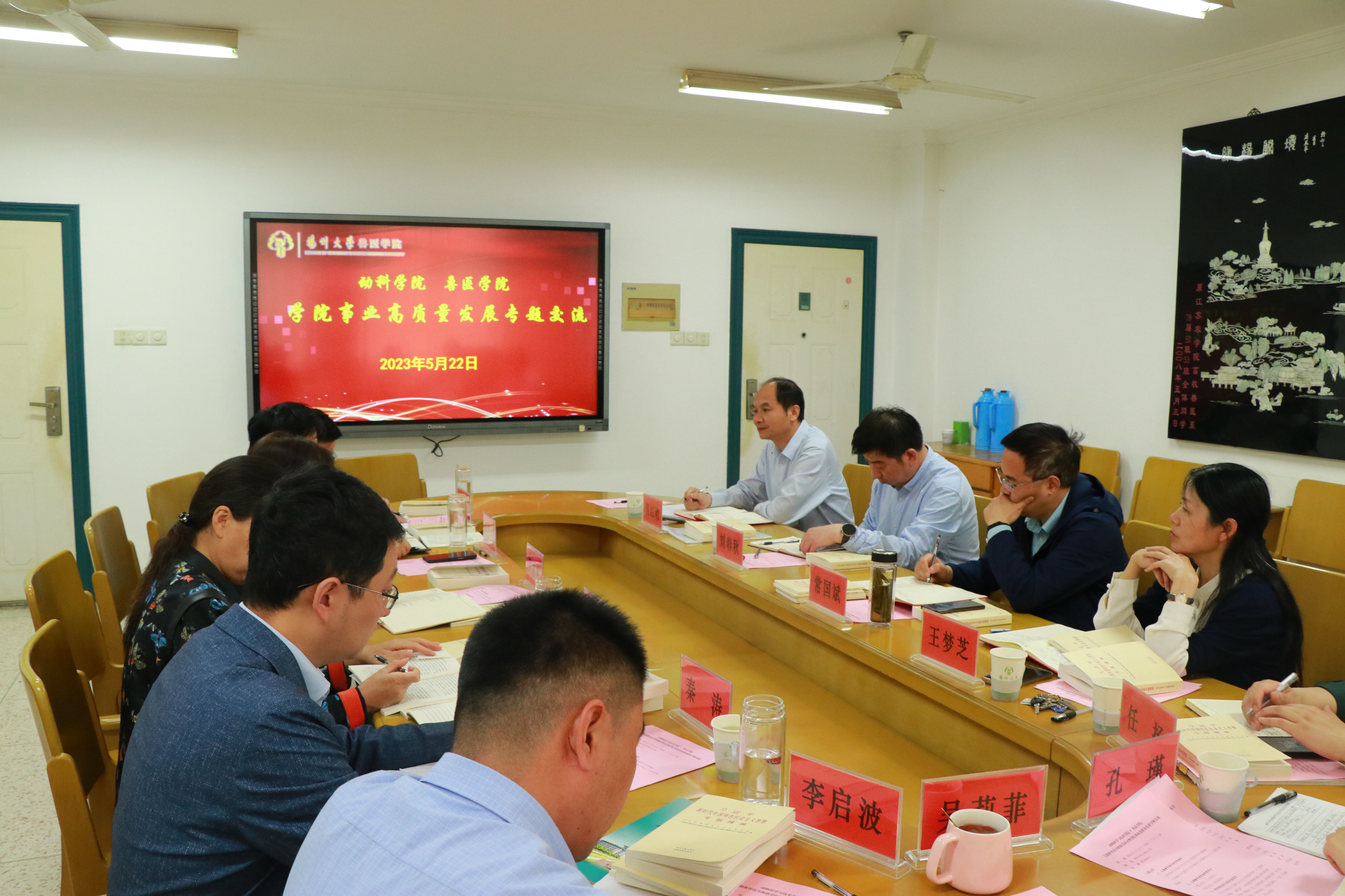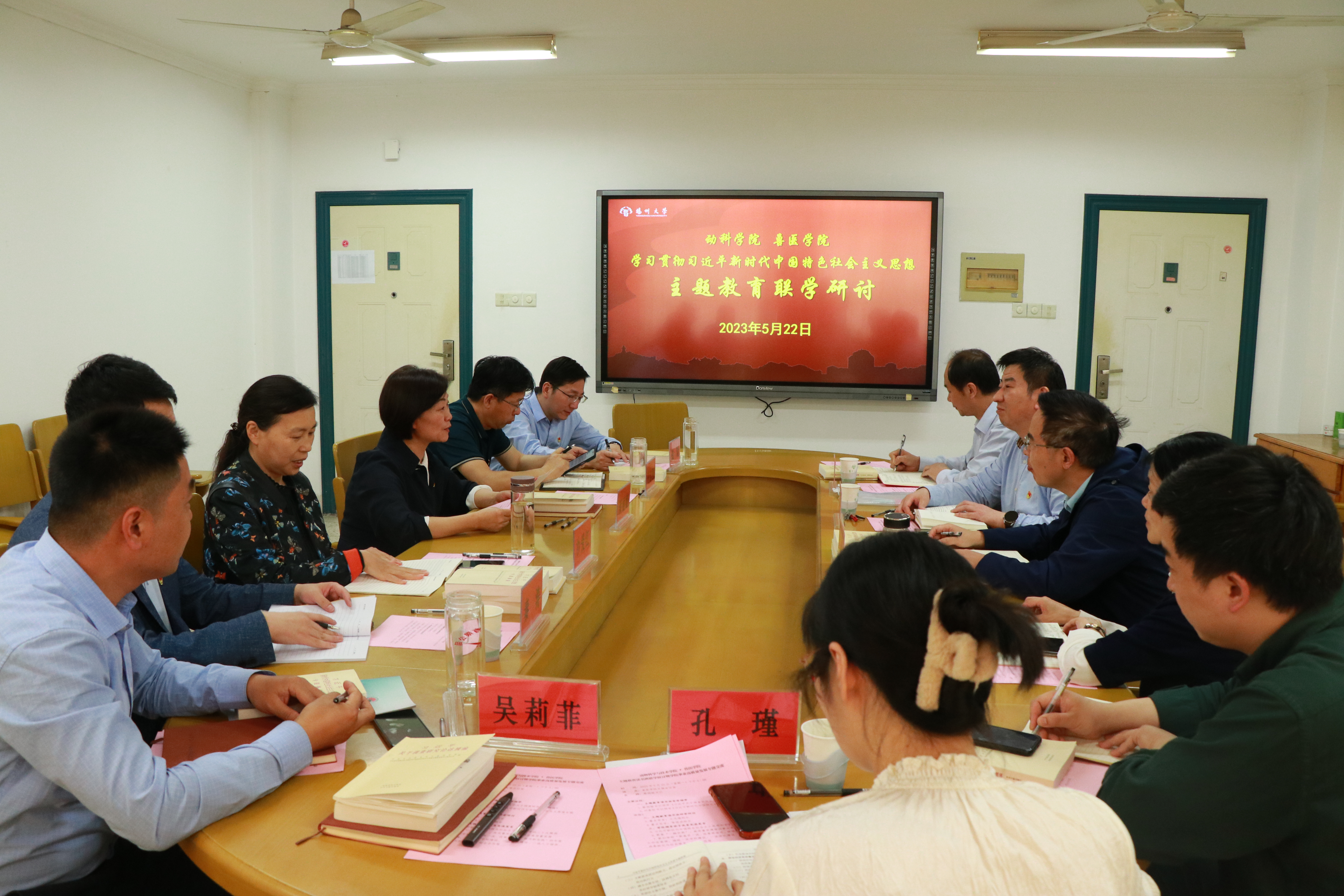 为深入学习贯彻习近平新时代中国特色社会主义思想主题教育,落实“学思想、强党性、重实践、建新功”总要求,推动党建和业务工作深度融合,共促事业高质量发展,5月22日下午,在兽医学院508会议室,我院与动科学院举行学习贯彻习近平新时代中国特色社会主义思想主题教育读书班联学研讨暨学院事业高质量发展专题交流会。会议由蔡丽娅主持,两院党委理论学习中心组主题教育读书班全体成员参加。