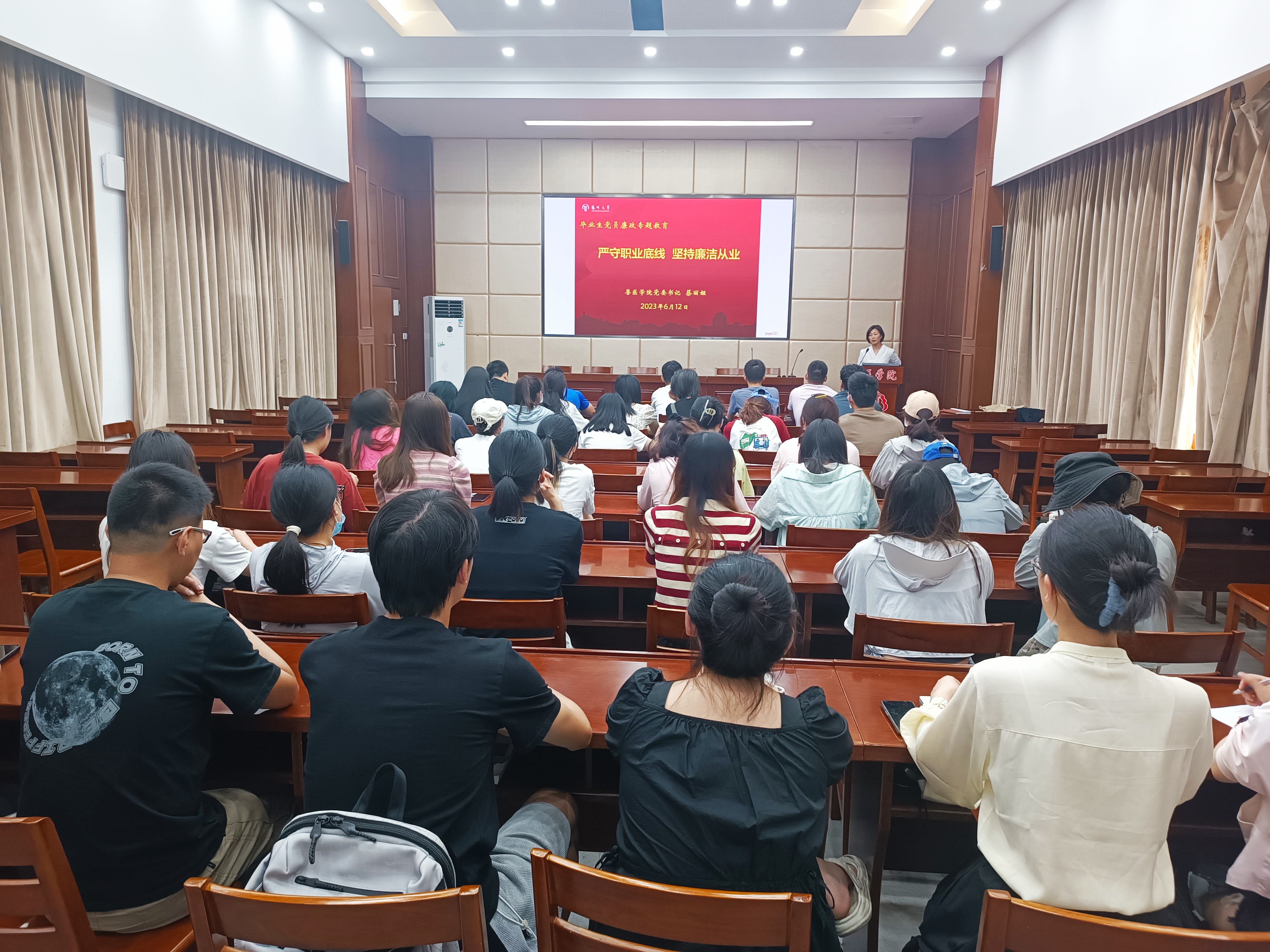 下午,院党委书记蔡丽娅作《严守职业底线,坚持廉洁从业》专题报告。蔡书记通过典型案例提醒毕业生党员要树立正确的人生观,时刻保持清醒的头脑,增强拒腐防变的能力。报告最后蔡书记寄语全体毕业生党员:希望他们明辨是非,抵制诱惑,守住人生底线;崇廉尚洁,明纪守法,筑牢思想防线;清白履职,踏实干事,坚守一身正气;独立思考,严格要求,秉持学术良知。成为一个有“社会担当”和“健全人格”,有“职业操守”和“专业才能”的扬大兽医人。
