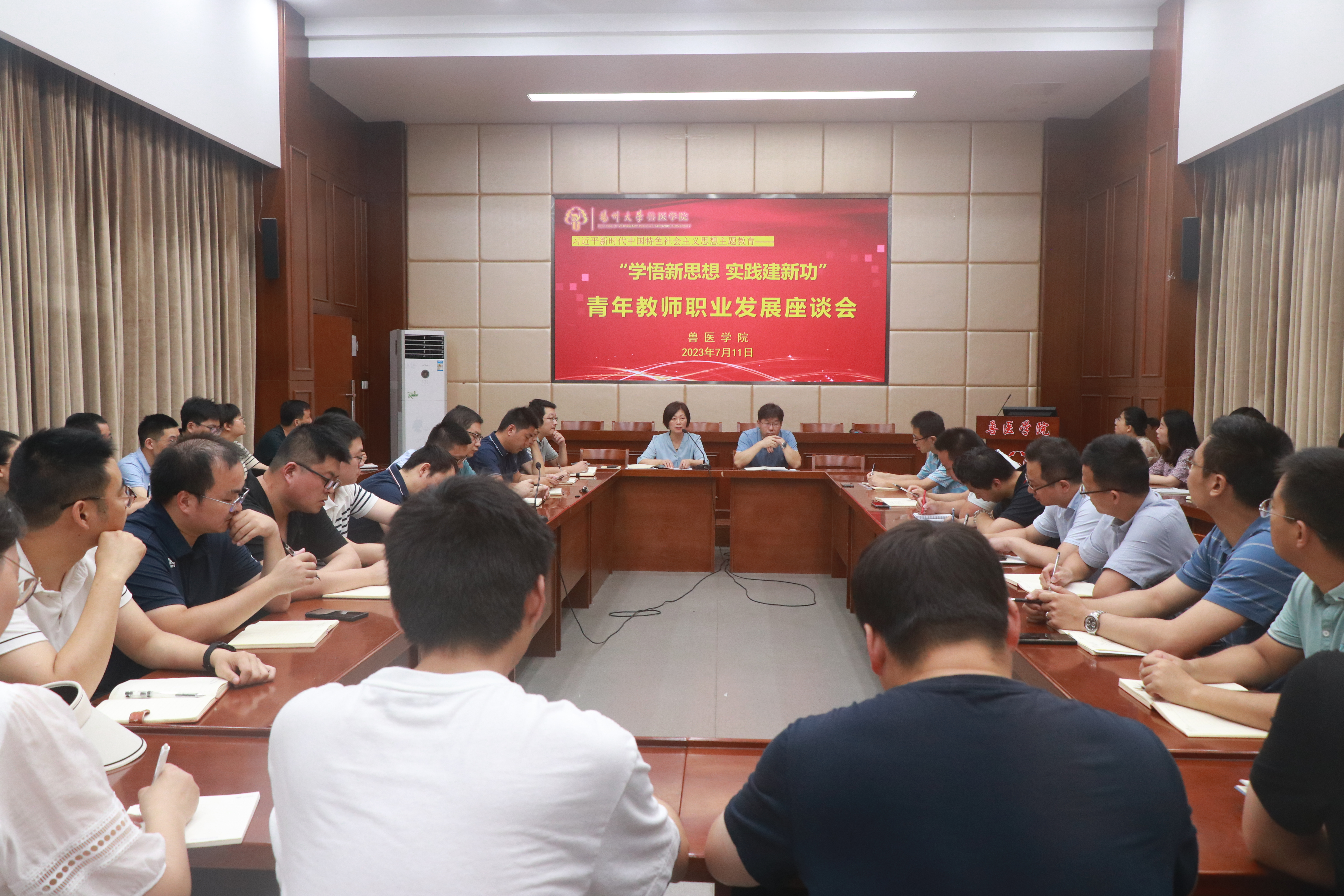 为把学习贯彻习近平新时代中国特色社会主义思想主题教育同推动学院中心工作结合起来,抓好调查研究,聚焦青年教师职业发展困境与诉求,切实提升青年教师教学科研水平,7月11日上午,我院在二楼报告厅召开了“学悟新思想 实践建新功”青年教师职业发展座谈会。全体院领导、学院40周岁(含)以下60余位青年教师参加座谈会,座谈会由院党委书记蔡丽娅主持。